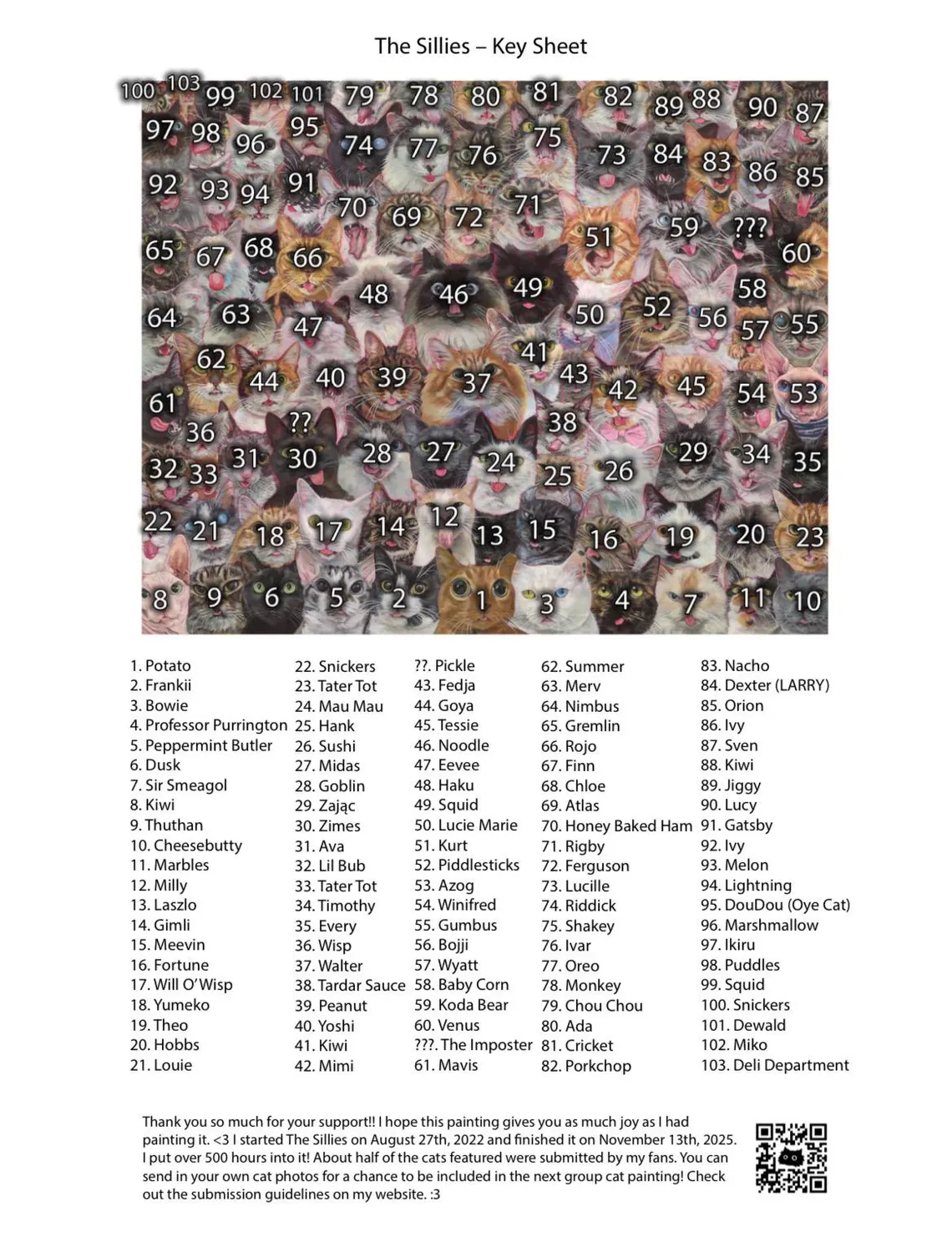 Comes with a key sheet listing the cats names and where to find them in the print, as well as individual cat info and a mini game printed on copy paper.